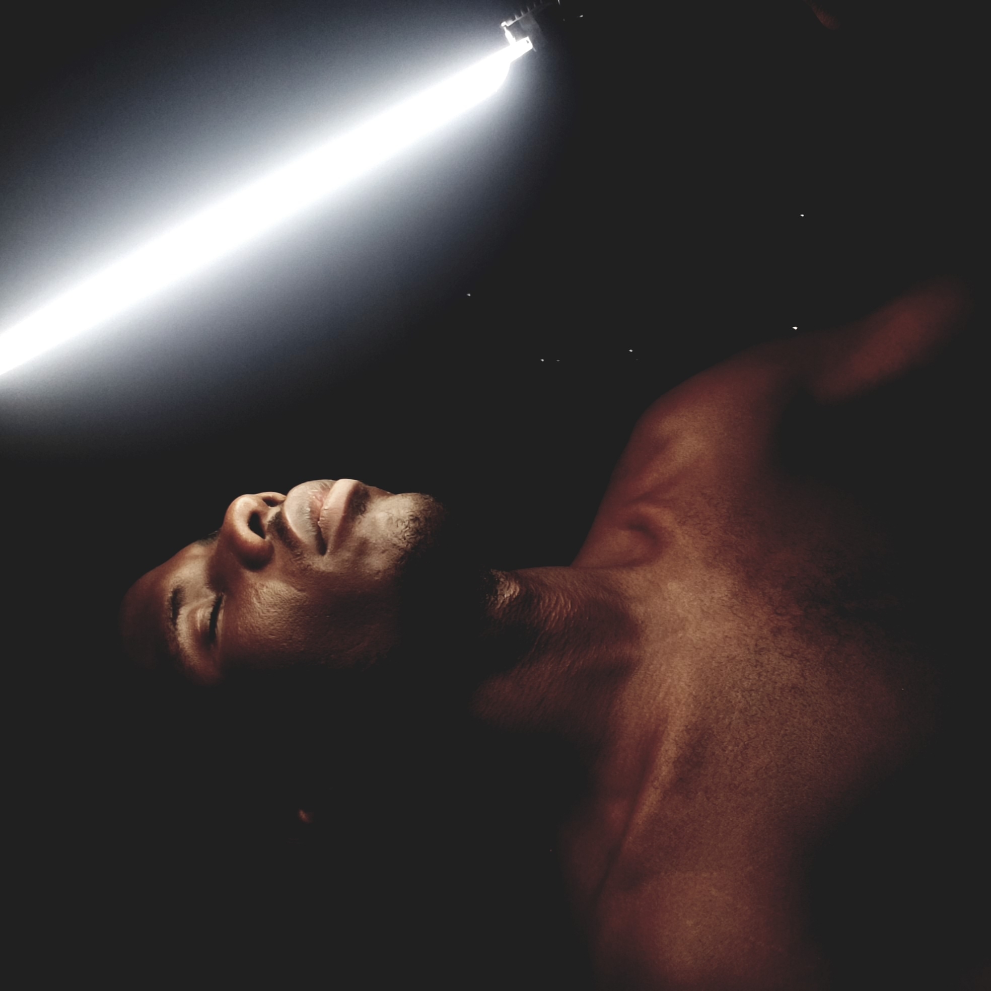 A dark-skinned individual, appearing to be male, is depicted in an upper torso portrait against a dark background. The subject's head is tilted upward and slightly to the right, with eyes closed and mouth slightly ajar. The right side of the face, neck, and upper chest are illuminated by a strong, diagonal white light source originating from the upper right portion of the frame. The light source itself, possibly a linear light fixture, is partially visible at the extreme upper right. The left side of the subject remains largely in shadow. Small, bright specks are visible in the dark background. The individual is bare-chested. The scene is located in the city of Narayi, Nigeria.