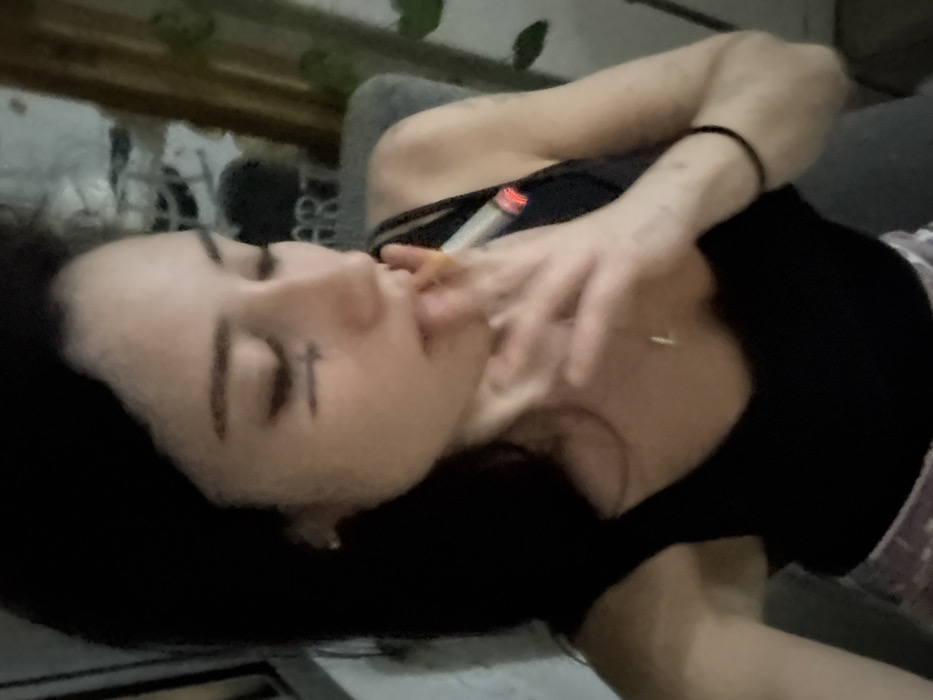 The image depicts a female subject indoors, likely within a private residence in Buenos Aires, Argentina; the precise location within the city is not discernible. The subject, a young adult with dark hair, is shown in left profile, looking downward. She wears a black tank top and light-colored, patterned lower garments. A black arrow-like marking is present below her right eye. She holds a lit cigarette with a visibly glowing red tip in her right hand, near her open mouth, where her tongue is partially visible. Her left hand is raised, fingers partially obscuring her face, appearing to interact with the cigarette or mouth area. A thin ring is on her left ring finger, and a black hair tie is on her left wrist. She is seated on what appears to be a light grey upholstered chair or couch. The blurry background indicates an interior space, featuring indistinct objects, including a partial rendering of the word "ART" and a green botanical element. The environment is dimly lit.