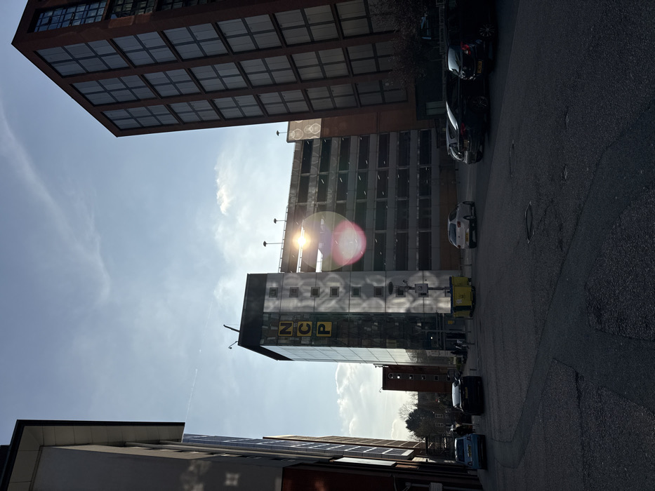 The image depicts Fairfax Street, Coventry CV1 5RP, United Kingdom, under a bright, clear sky with high scattered clouds and a faint airplane contrail visible in the upper left quadrant. The perspective is from street level, looking towards the north-east. In the center, a multi-story car park building is prominent. Its front section features a modern, dark glass facade with "NCP" written vertically in large yellow letters on its left side. Behind this glass facade, the grey concrete levels of the car park structure are visible, topped with multiple dark lampposts. The sun is positioned directly behind the upper levels of the car park, causing a significant bright lens flare and a reddish halo effect. To the far left, a portion of a light-colored, multi-story building with dark window sections is partially visible. To the immediate right of the car park, a tall, dark red-brick building with numerous uniformly spaced rectangular windows extends upwards beyond the frame. In the mid-distance on the left, a smaller, dark red-brick building with arched windows is visible. The foreground consists of dark asphalt pavement, showing subtle texture, manhole covers, and an indistinct curb line. On the left side of the street, a light blue Fiat 500 and a dark hatchback are parked. In the midground, a white five-door hatchback is in motion, driving away from the viewer. On the right, two dark hatchbacks are parked. Two yellow industrial bins and a grey bollard are situated on the pavement near the base of the NCP building. Several indistinct human figures are visible walking on the pavement near the NCP entrance. Strong backlighting from the sun creates deep shadows across the foreground and on the facades of the surrounding buildings.