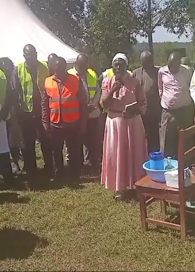 A group of approximately 15 people are gathered outdoors on a grassy field. Most of the men are wearing neon yellow safety vests, while one man wears an orange vest. A woman stands in the center speaking into a microphone. She is wearing a pink dress and a white head covering. A wooden chair with a blue basin and a white container on it stands in front of her. A large white tent is visible in the background, along with trees and a parked car. A black speaker on a tripod stands to the left of the group. The people appear to be engaged in some kind of formal gathering or event. They are either listening to or looking down at the woman as she speaks.