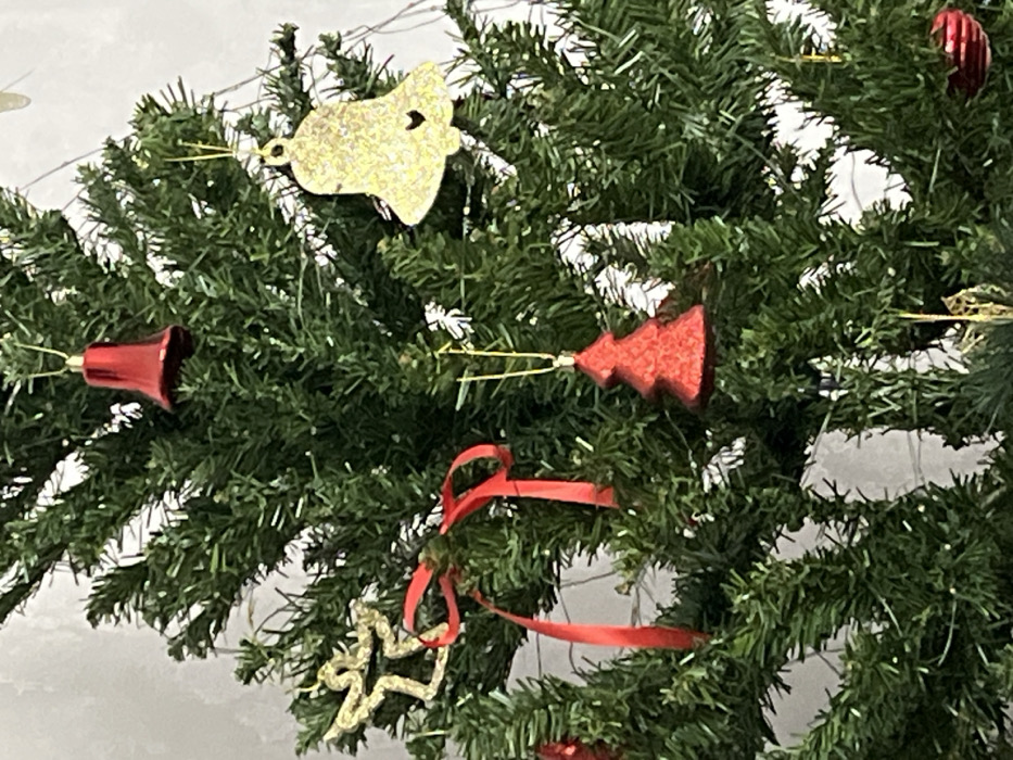 - "A close-up, vertical shot depicts a segment of an artificial Christmas tree decorated with various ornaments and ribbons" by FM-XlCcP2, licensed under CC BY 4.0