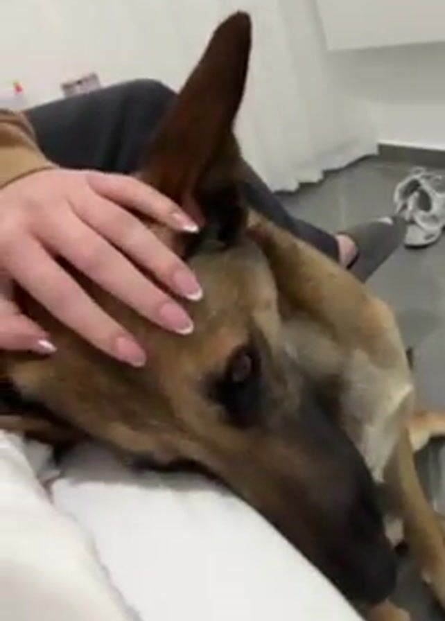 brown and tan Belgian Malinois dog lying on a white surface, seemingly a bed. A person, wearing a brown sweatshirt and dark pants, is petting the dog's head with their left hand, which has painted white nails. The dog appears relaxed, initially with eyes closed and later looking up towards the person. The background includes a white wall, sheer curtains, and some clutter on a shelf.