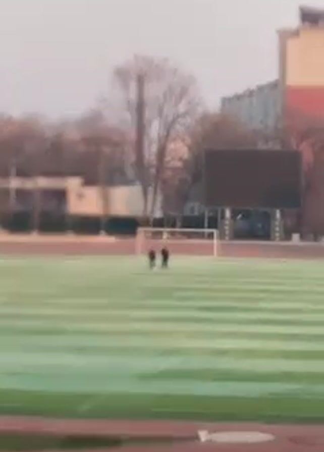 two people walking on a soccer field covered with a stripe-like pattern of green and white. They walk towards a soccer goal at the far end of the field and stop in front of it. In the background are leafless trees, buildings, and a large electronic scoreboard. The sky is overcast, and the light is diffused. The video is shot from a distance, likely from an elevated position on a running track surrounding the field.