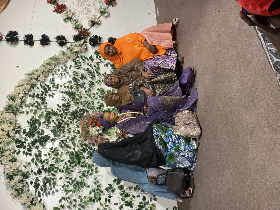 Five women wearing colorful, traditional Muslim garments are seated close together against a wall decorated with white and green floral garlands
