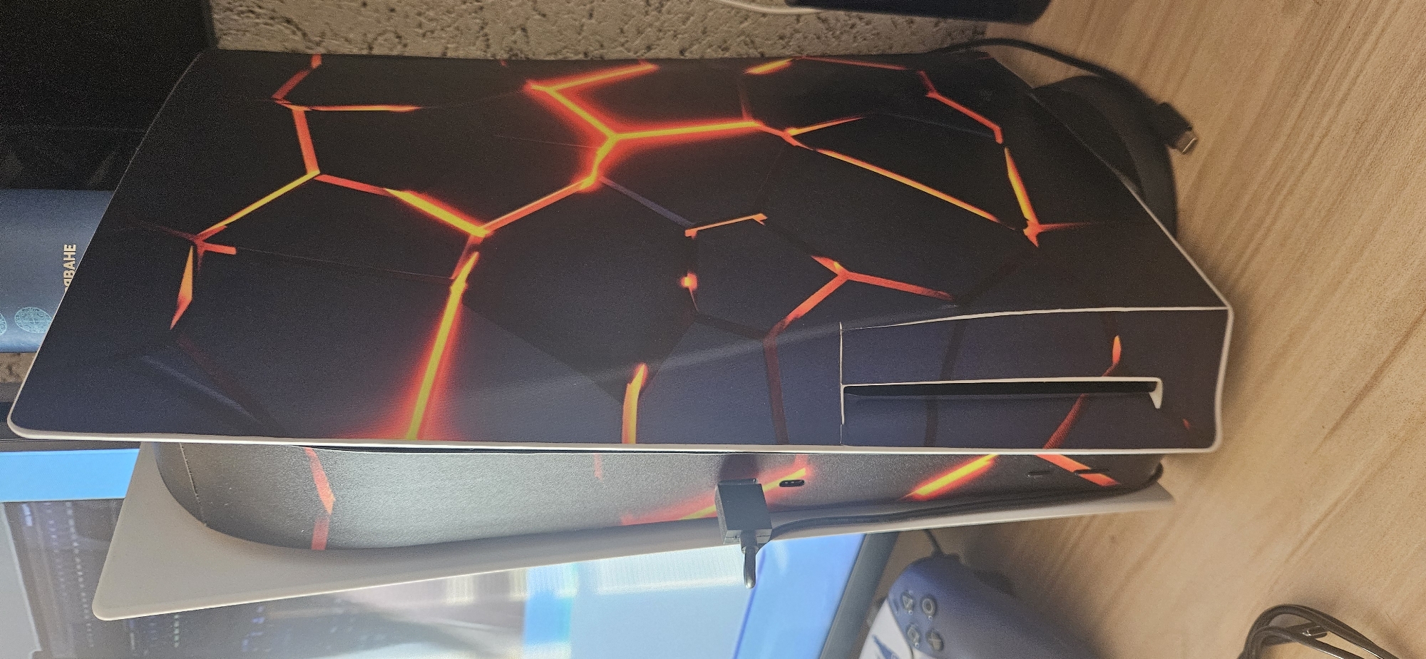 A PlayStation 5 console is displayed. It is covered with a black and red/orange geometric-patterned skin. The console is oriented in a vertical position. Various cables are plugged into the device. Part of a computer monitor is visible below the console. A book is partially visible on the left side of the image. The scene is indoors. No information available to make any connection to the city of Sofia, Bulgaria.