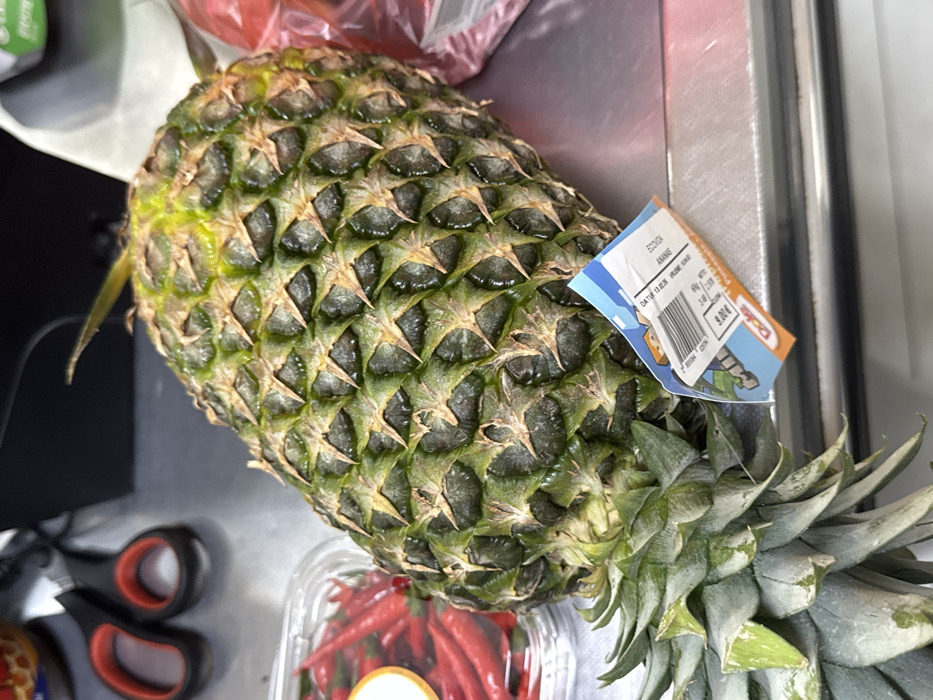 A pineapple dominates the frame, displaying its green and brown textured skin. Attached is a price tag indicating the fruit's cost. A container of red chili peppers sits below, adding a splash of color. The background includes a pair of scissors and other indiscernible objects on a cool-toned surface.