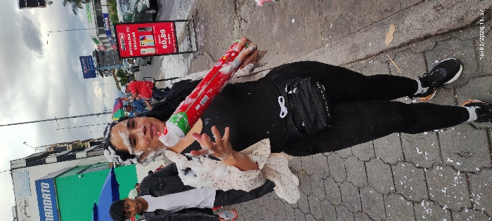 A person in black leggings and a black top lies on a gray stone-paved ground. The person has white foam on their face and hair, holding a red and green foam spray can. A black purse hangs on their side. In the background, there are buildings, street signs, and other people, including one person wearing a white shirt. The picture also shows a date stamp in the upper right corner.