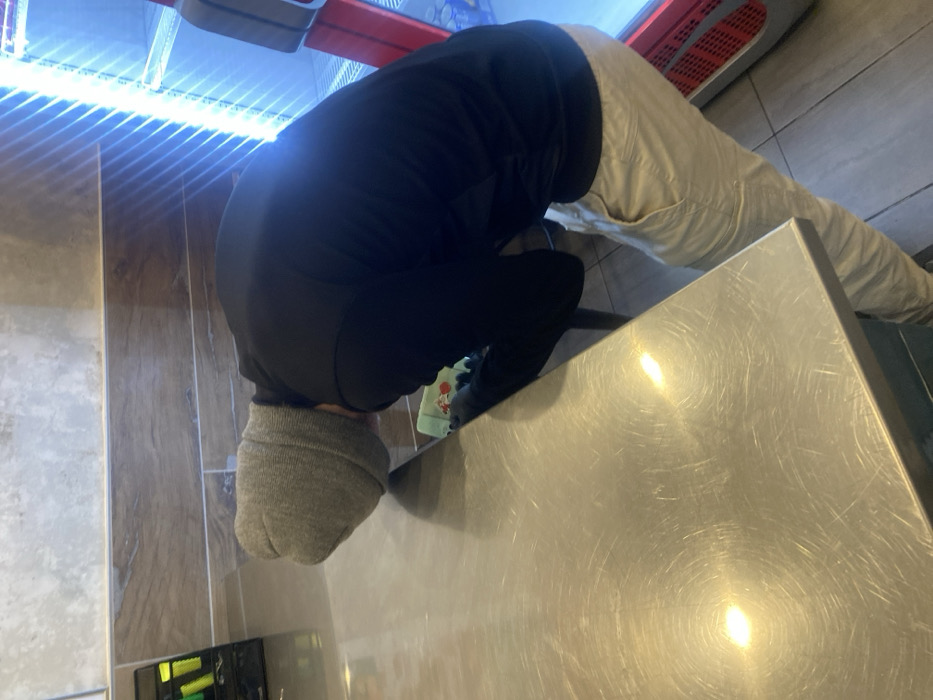 A person with a gray beanie, black jacket, and light-colored pants is bending over, seemingly inspecting or cleaning a stainless steel countertop