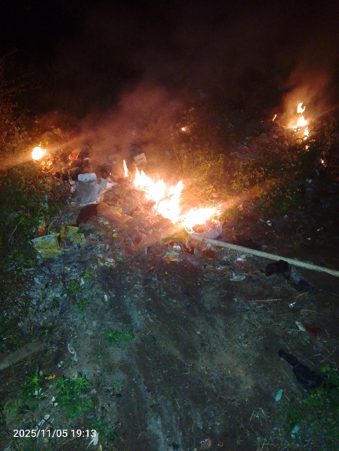 The scene depicts an outdoor, unpaved area within the city of Unknown, Unknown, at nighttime, specifically at 19:13 on November 5, 2025. Multiple fires are actively burning amidst a collection of debris and sparse vegetation. The primary combustion point is centrally located, exhibiting bright orange flames and a significant plume of smoke. Additional, smaller fires are visible in the background, further to the right, also emitting flames. The ground consists of dark earth, with patches of green vegetation present in the foreground and around the edges of the burning material. The burning substances appear to be various forms of refuse, including what resembles packaging and general waste. A light-colored, linear object, potentially a pipe or hose, is observed on the ground extending from the mid-right. No individuals are visible within the frame.