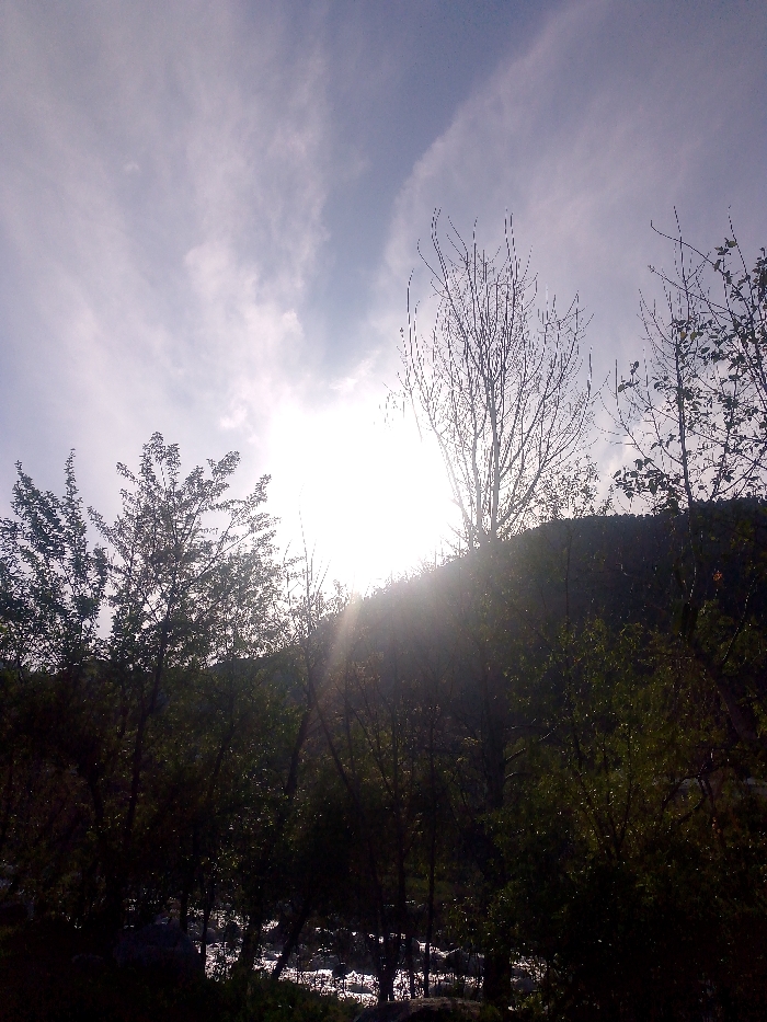 The image depicts a natural outdoor environment in Dharyal, Pakistan, captured with strong backlighting. The upper portion shows a partially cloudy sky, with a powerful, overexposed light source, likely the sun, located in the upper-right quadrant, generating lens flare that radiates downwards and to the left. The foreground and mid-ground consist of dense vegetation, primarily trees and foliage, appearing as dark silhouettes due to the backlight. Several trees with visible green leaves are present on the left, while a prominent, bare deciduous tree with thin branches is silhouetted against the bright sky and light source. In the lower mid-ground, a body of water, possibly a river or stream, is visible, reflecting the bright light in shimmering white patches. Submerged or shoreline rocks are discernible within and around the water. The background features a dark, tree-covered hillside or mountain range, partially obscured by the foreground vegetation and the bright light source. No people, animals, or artificial structures are discernible.