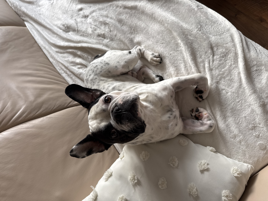 - "A black-and-white French Bulldog is positioned on a cream-colored, plush throw blanket, which covers a portion of a light beige leather sofa" by FM-uEVzD3, licensed under CC BY 4.0