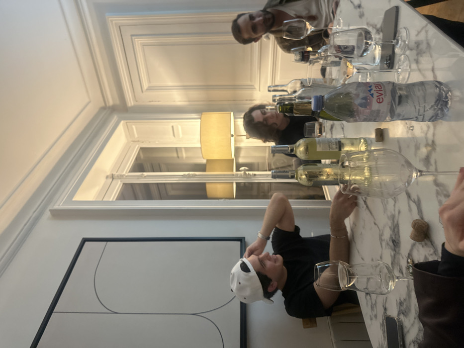 A marble table with multiple wine bottles and glasses dominates the scene, positioned in a room with ornate crown molding and tall windows. Three people are visible at the table, one wearing a baseball cap and black shirt, another with long hair, and a third partially visible at the top. A framed art piece hangs on the wall behind the table. The room is brightly lit, likely from both natural light and interior lighting.