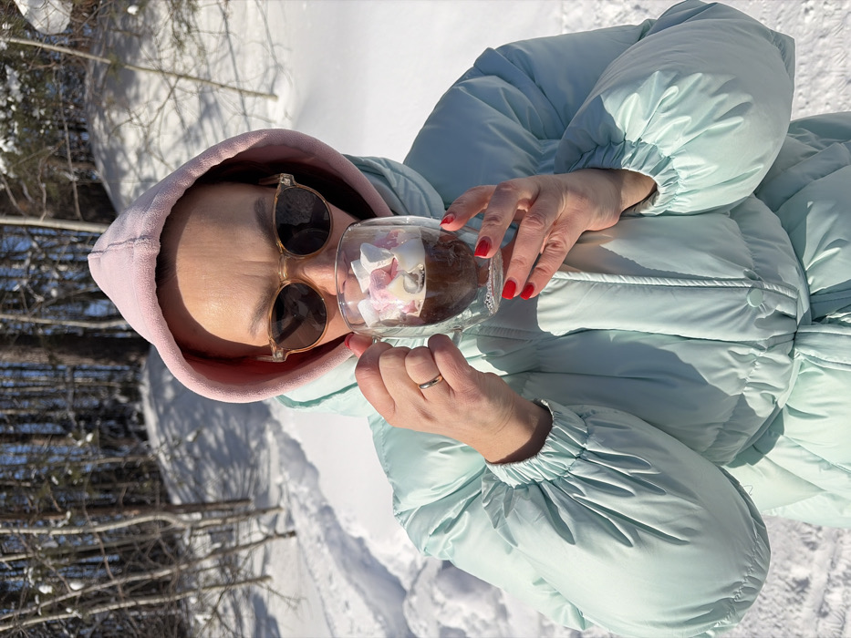 An individual is depicted outdoors in a snow-covered wooded area in Noviy, Russia, on a bright, sunny winter day. The subject, an adult, is visible from the chest up, wearing a light blue or mint green puffy winter jacket with a pink-lined hood pulled over their head. They are equipped with round, light-framed sunglasses. The individual holds a clear, double-walled glass mug with both hands, positioned near their mouth as if consuming its contents. The mug contains a dark liquid beverage topped with several white and pink marshmallows, some exhibiting signs of melting. A simple gold-colored band is visible on the ring finger of the left hand, and both visible hands have red nail polish. The background consists of a dense forest of slender trees, with the ground uniformly covered in deep white snow. A narrow, snow-covered path is discernible through the trees in the mid-ground. The scene is illuminated by strong, direct sunlight.