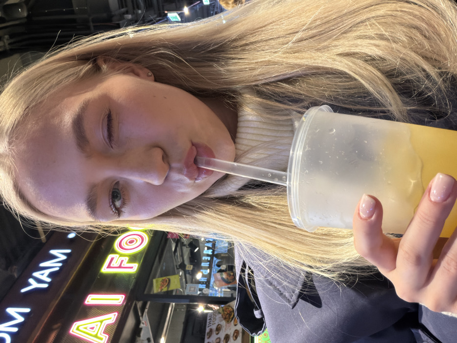 A close-up, front-facing image depicts a young blonde female winking with her right eye while actively drinking from a clear plastic cup via a plastic straw. Her lips are pursed around the straw, and her left eye is open, looking directly forward. She has long, straight blonde hair, a fair complexion, and a small stud earring is visible in her right earlobe. She is dressed in a light-colored turtleneck sweater under a dark blue coat. Her right hand, featuring nails with a light, subtly glittery polish, holds the frosted plastic cup containing a yellow liquid. The background is blurred, revealing the interior of a commercial establishment, specifically a food court or restaurant. Prominent neon signage is visible, partially displaying "YAM" and "THAI FOO" (indicating "TOM YAM" and "THAI FOOD") in bright pink/red and yellow/green colors. This suggests the scene is within a Thai food establishment, likely part of the "Tom Yam" chain, located in a food court within Saint Petersburg, Russia.
