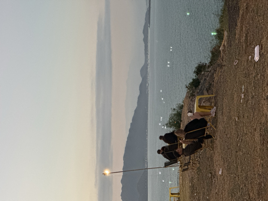 The image displays an elevated coastal viewpoint in Vĩnh Lương, Vietnam, captured at dusk. The foreground consists of dry, reddish-brown soil scattered with various pieces of litter, including plastic bottles and paper. Six individuals are positioned in this area. In the immediate foreground, a male individual in dark clothing is seated on a dark chair facing generally right but looking left, with his right hand near his face. Adjacent to him, a female individual in a dark top and light-colored shorts, wearing white sneakers, sits on a dark chair facing left, holding a white object near her chest. Both are positioned near a bright yellow plastic table. Behind them, four additional individuals are seated in dark chairs, their forms less distinct, appearing to observe the scene. To the left of the group, a tall, slender pole supports a single illuminated light bulb, providing localized light. The midground features a calm body of water, likely a bay or sea, extending towards the horizon. Numerous small, bright lights, indicative of vessels or buoys, are visible across the water's surface. In the background, a range of dark green mountains and hills rises from the distant shore, silhouetted against a fading sky. The sky transitions from a pale blue-grey overhead to a faint yellowish hue near the horizon, with thin, horizontal cloud formations present.