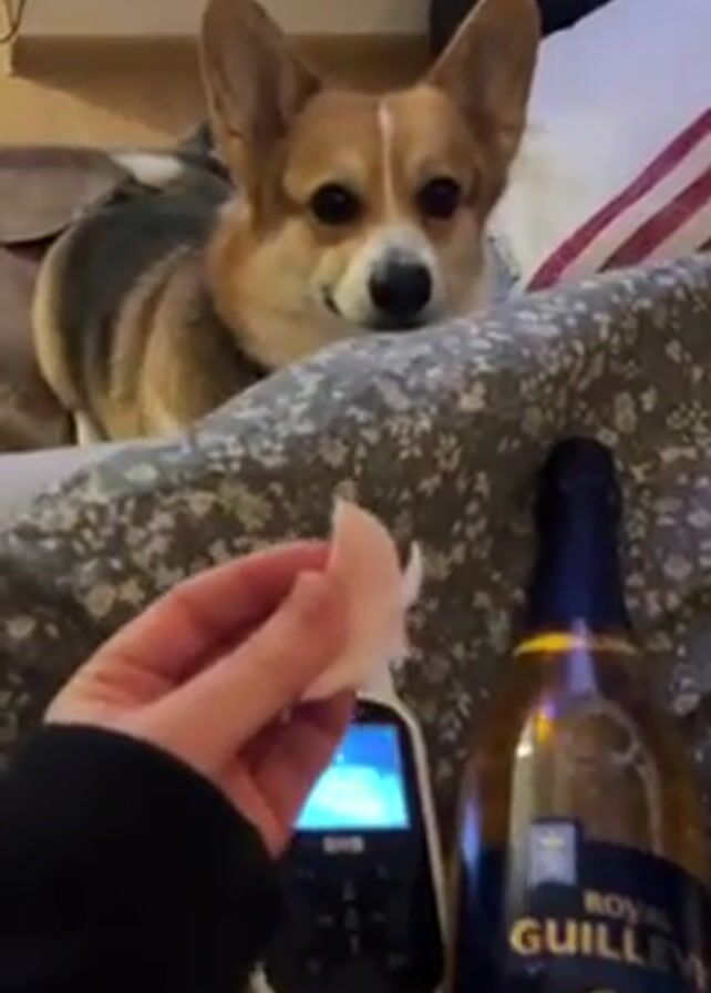 Here's a detailed description of the video: The video shows a person holding a piece of food (likely a small slice of meat) towards a corgi dog that is sitting on a bed. The corgi is facing the camera with its ears perked up. The bed has a floral pattern on the duvet cover. Next to the person’s hand, on the bed, is a bottle of "ROYAL GUILLEVIE 2024" and a baby monitor. The corgi licks the food and takes it from the person's hand. The room is illuminated by warm, indirect light. There is a white pillow on the bed behind the corgi. A woven basket is also partially visible on the bed. The wall behind the bed has a three-pronged electrical outlet.