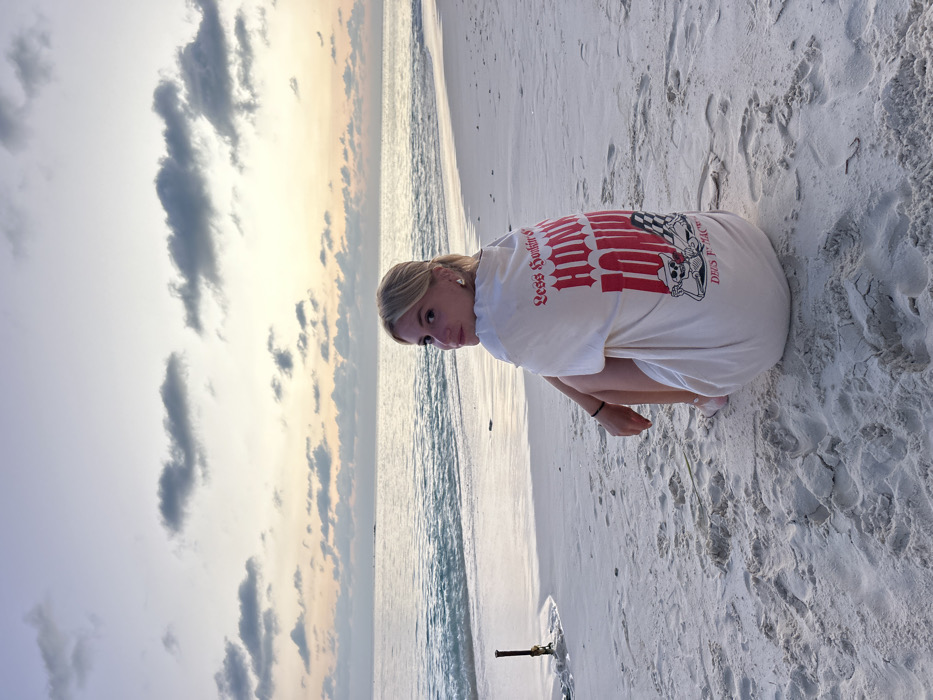 A single female individual is seated on a light-colored sandy beach in Thoddoo, Maldives, with her back mostly towards the camera, looking over her left shoulder. She has blonde hair pulled back and wears an oversized, light-colored t-shirt featuring a red graphic on the back that reads "Less Hookin' More Honkin'", with an accompanying illustration of a skeleton, a checkered flag, and the text "DEUS EX MACHINA". Her right arm is visible, adorned with a dark bracelet. Her bare feet are visible on the sand. The immediate foreground consists of textured sand with subtle undulations and faint footprints. To the left of the frame, a dark, vertical post or pipe-like object is partially submerged in the shallow water near the shoreline. The background features calm, light blue-green ocean water with minimal waves breaking gently. The horizon line is clear. The sky exhibits a gradient of colors, transitioning from light orange and yellow near the horizon to pale blue and purple overhead, indicating either dawn or dusk. Scattered clouds, varying in size and density, are visible across the sky. A faint, distant landmass or structure is discernable on the horizon in the left-center portion of the image.