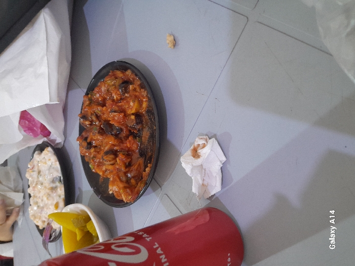 The image captures a close-up, elevated view of a light gray tabletop in Deir el-Balah, Palestinian Territory, set with multiple food items. In the foreground on the left, a partially visible red Coca-Cola bottle stands upright. To its right, a small white bowl contains several bright yellow pickled items. Central to the frame is a black, round plate holding a reddish-orange stew-like dish with darker, irregular solid components. Behind this, another black, round plate contains a white, creamy salad with various light and dark inclusions, with a silver fork partially submerged within it. A human hand, positioned at the top left, is seen holding a white, soft material, possibly bread or a napkin. To the right, a crumpled white paper napkin with brown stains rests on the table, next to a small, light-colored food crumb. In the upper right quadrant, a white paper bag is partially visible, containing a bright pink or purple plastic object. The tabletop surface exhibits faint lines and patterns. The watermark "Galaxy A14" is present in the bottom left corner.