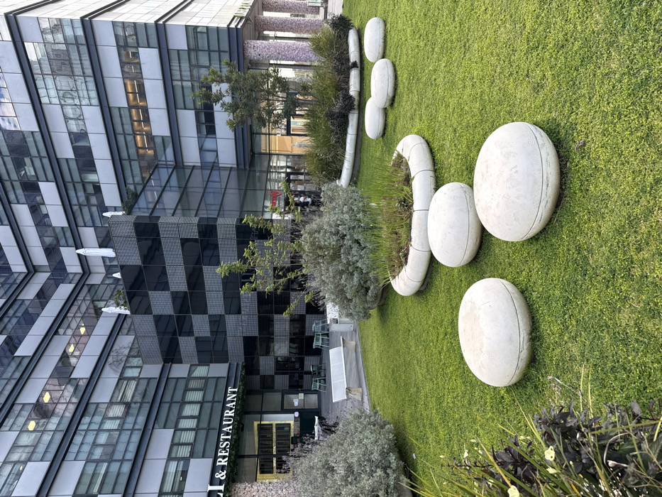 The image depicts a modern urban complex with a landscaped green space, located in Holon, Israel. In the foreground, a vibrant green lawn is visible, featuring several large, smooth, off-white, flattened spherical stone objects, likely serving as seating or decorative elements. Also on the lawn are several circular concrete planters containing various green plants and small shrubs. In the midground, a paved area separates the lawn from the buildings. A light-colored metal bench is present on the paved area. To the left, a commercial establishment with a visible sign "DELI & RESTAURANT" has an outdoor seating area with small tables and light green chairs. Further right, a larger glass entrance is visible, with several indistinct human figures inside. Various mature shrubs and small trees are interspersed throughout the green spaces and paved areas. The background is dominated by a multi-story, modern building complex characterized by a facade primarily composed of gray panels and numerous large glass windows, some reflecting ambient light. A distinctive section of the building features a black and white checkerboard pattern made of alternating reflective and textured square panels. Several white, folded patio umbrellas are visible on an upper-level terrace or balcony area of the building. To the far right, large, decorative cylindrical pillars with a textured, possibly floral, pattern support an overhang. The overall scene appears well-maintained under natural daylight conditions.