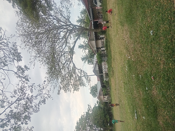 A daytime scene in Palohgadeng, Indonesia, depicts an open, irregularly grassed field under an overcast sky. Bare tree branches extend from the upper left, while a large, mature tree with extensive branching and sparse foliage occupies the right mid-ground. Five individuals, likely children, are dispersed across the field. On the far left, one person in a light green shirt and dark shorts stands upright. Near the center-left, another person in a yellow and black patterned shirt and dark shorts stands. Towards the right, two individuals are interacting with a light-colored ball: one in a red shirt and dark shorts, and another in a black shirt and light shorts. A fifth individual, clad in a red shirt and dark shorts, is seated or kneeling on the ground further right. Scattered litter, including white plastic remnants and a red wrapper, is visible on the grass. In the background, a row of single-story residential structures with light-colored walls and dark roofs lines the far edge of the field, partially obscured by fencing. Additional trees and palm trees are visible behind and around the houses.