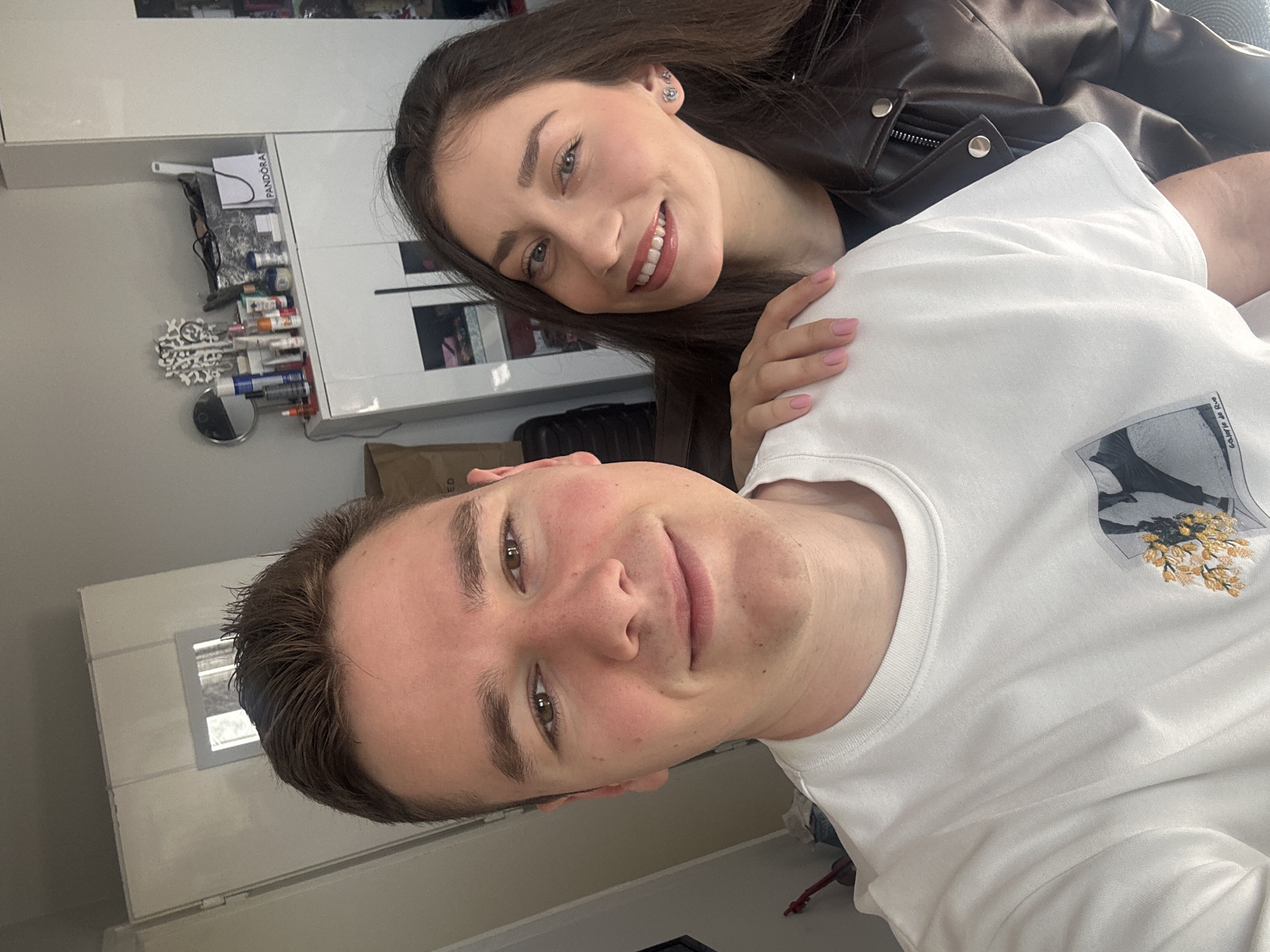 A selfie of a man and woman indoors. The man, with short brown hair, is wearing a white t-shirt with a print on the chest. He is holding the camera and smiling slightly. The woman has long brown hair and is wearing a dark leather jacket. She is positioned behind the man, with her hand on his shoulder, and is also smiling. The background shows furniture, including a white cabinet with items such as a Pandora box and toiletries. The photo may have been taken indoors in a living room. There is no indication that this image was taken in the city of Bukovlak, Bulgaria.