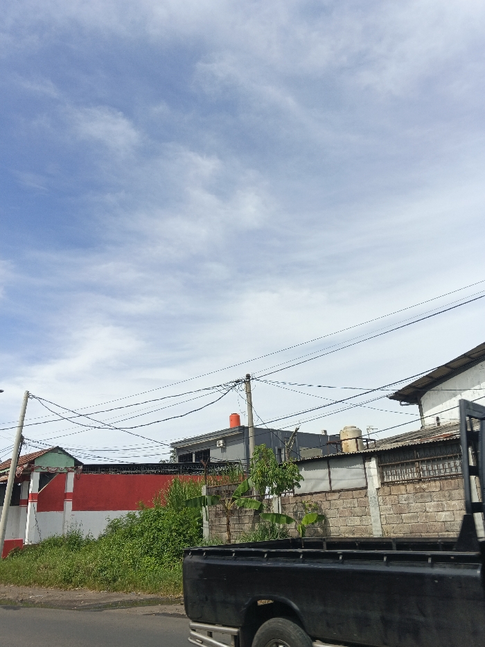 A partly cloudy sky overlooks a street scene. Various buildings and walls are visible, including one painted red and white. An orange water tank sits atop a gray building. A black truck is partially visible in the foreground, along with overgrown foliage. Overhead, electrical wires crisscross the sky.