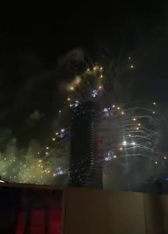fireworks going off around a skyscraper at night. The skyscraper is lit up with a pattern of circles and blue and green lights. There are also red lights near the top. The fireworks are gold, blue, and red. There is a low wall at the bottom of the frame. The video is taken from a distance.