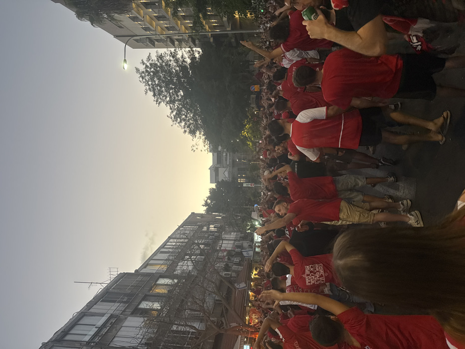 The image depicts a densely packed crowd of hundreds of individuals, predominantly male, occupying an urban street in Tel Aviv, Israel, during twilight hours (sunset). The majority of the people are wearing red shirts, many explicitly displaying Hebrew text indicating "Hapoel Tel Aviv" (הפועל ת"א) branding. Numerous individuals are engaged in celebratory actions, with arms raised overhead, some appearing to clap, pump fists, or gesture enthusiastically. One person on the far right holds a green beverage can. The street is flanked by multi-story buildings. On the left, an older, utilitarian building of approximately 4-5 stories features numerous windows, some with external shutters and visible air conditioning units. An antenna structure is present on its roofline. On the right, a more contemporary building, approximately 5-6 stories tall, displays uniform balconies and external accent lighting. Trees are visible throughout the scene, and a modern street light with a bright white LED lamp is illuminated on the right side of the street. The sky exhibits a gradient from a yellowish-orange glow at the horizon to a lighter blue-grey overhead.