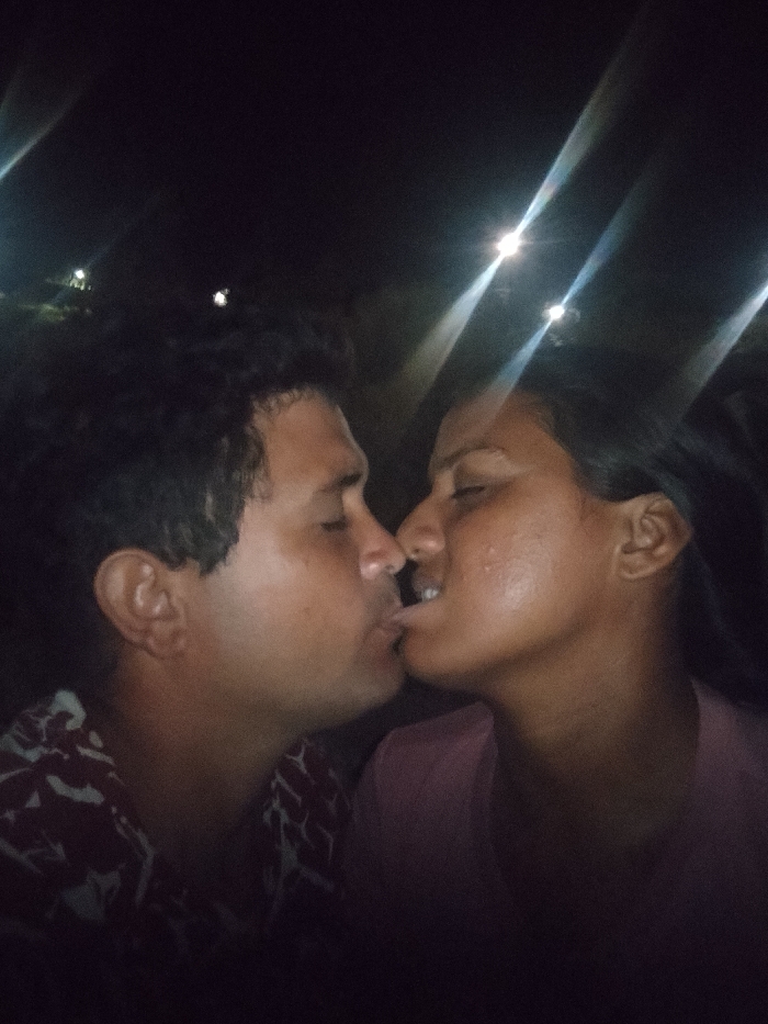 The image displays two individuals, an adult male and an adult female, engaged in a kiss, in an outdoor setting at night, location Unknown, Unknown
