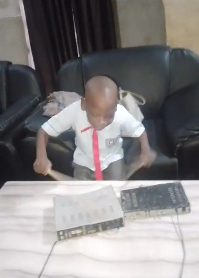 A young boy wearing a school uniform with a red tie is standing behind a table and playing drums on two electronic devices, possibly satellite receivers. He is using drumsticks and hitting the tops of the devices with energy and focus. The table has a light-colored surface with a marble-like pattern. Behind the boy is a black leather couch with what appears to be a backpack or bag resting on it. A dark curtain hangs in the background, and part of a wall and ceiling are visible as well. The room appears to be indoors and casually furnished.