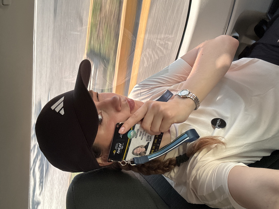 A woman wearing a black Adidas baseball cap, a white T-shirt with a "DOBEL" pin, and a silver watch holds up a Telcel ID badge with her name "MARIANA" printed on it. She's indoors near a window, possibly on a train or bus, as suggested by the blurry background. Her hair is tied back in a ponytail.