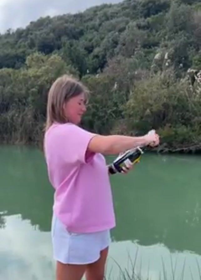 A young woman is shown opening a bottle of champagne with a knife. She is standing on the edge of a murky green body of water, with trees and a hill in the background. The woman has blond hair and is wearing a pink t-shirt and white denim shorts. She holds the champagne bottle in her left hand and a large black knife in her right. She strikes the neck of the bottle with the knife, successfully severing the top of the bottle. Champagne sprays out as she cheers.