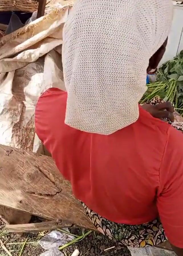 A woman wearing a red shirt and a white head covering sits on a wooden surface at a market