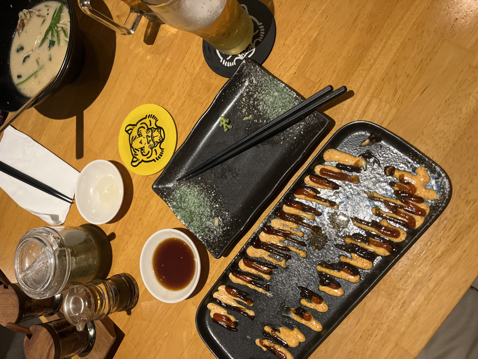 The scene depicts a wooden tabletop in a restaurant located in Canggu, Indonesia, after a meal. No individuals are visible. In the foreground, a long, rectangular black ceramic plate displays remnants of food, characterized by extensive drizzles of two distinct sauces: one orange-red and one dark brown, suggesting the consumption of sushi or similar items. Adjacent to this, a second rectangular black ceramic plate is largely empty, bearing a pair of black chopsticks resting diagonally, along with minimal green and white food remnants. Towards the center-left, a small white circular bowl contains a dark brown liquid, consistent with soy sauce. To its right, a smaller, empty white circular bowl is present. Further back, a clear glass jar with a lid and an internal scoop contains a greenish liquid or paste. Next to it, a clear glass cruet likely holds a liquid condiment. Two wooden spice shakers with lids are positioned behind these items. In the upper-right portion of the image, a black ceramic bowl holds a partially consumed creamy ramen dish, garnished with green vegetables and other ingredients. To its lower left, a yellow circular coaster featuring a black cartoon-style tiger head design is visible. A tall glass containing a partially consumed golden liquid, consistent with beer, shows condensation on its surface and rests on a black circular coaster with a white abstract design. A white folded napkin with another pair of black chopsticks lies to the left of the ramen bowl. The overall lighting suggests an indoor evening or low-light setting.