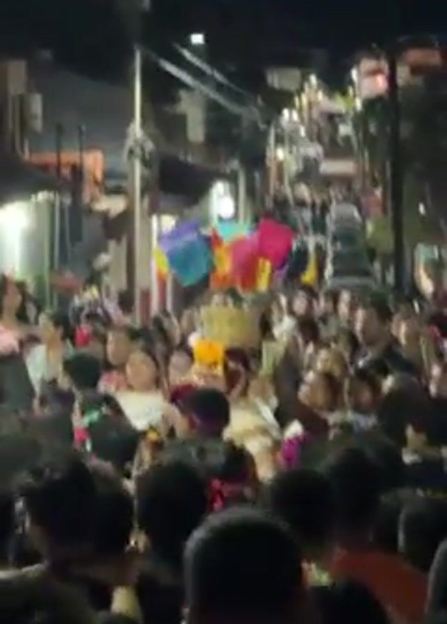 large crowd of people gathered on a street at night. The crowd appears to be dense, and people are close together. There are buildings visible along the sides of the street, and it appears to be a town or village setting. The lighting is dim, with streetlights illuminating the scene. The individuals at the front of the crowd are dressed in traditional attire, with elaborate headwear and colorful clothing. Some are holding large, colorful paper decorations. The general impression is that the crowd is part of a festive procession or celebration.