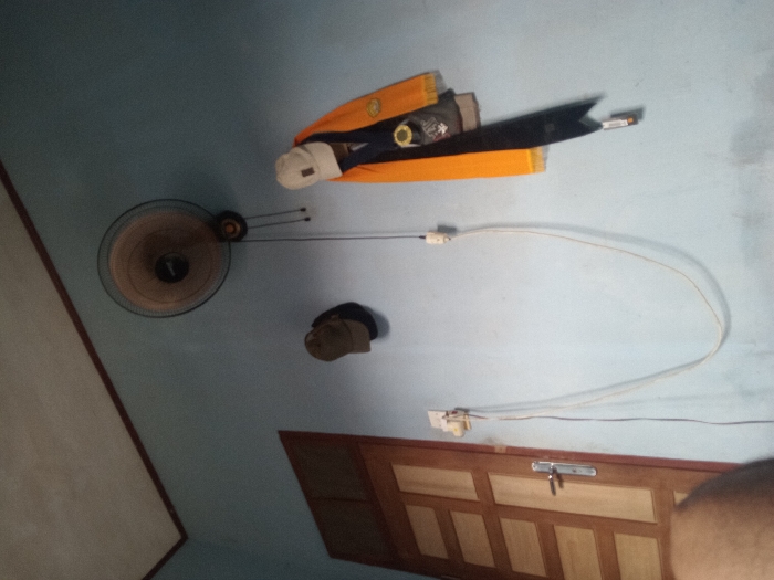 A room with a light blue ceiling. A brown-bladed fan is attached to the ceiling. Above it are items in orange, black, and white, and a hat. A long white cord runs across the ceiling to a white outlet near a brown wooden door. A latch is visible on the door. A partial view of a person's head is in the bottom right corner. A white wall is on the left.