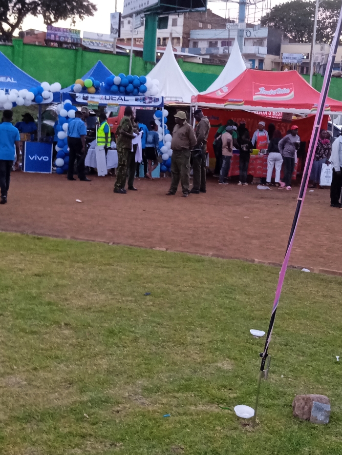 An outdoor event features several tents with blue, white, and red colors. People gather around the tents, including individuals in uniforms. Blue and white balloons decorate one tent, which also displays the word "VIVO." A red tent bears the brand "Indomie." The foreground shows a grassy area, with a pole and some disposable cups. Buildings are visible in the background.