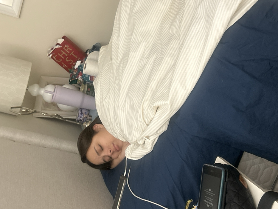 - "A person is sleeping in a bed with blue sheets and a striped white comforter partially covering their head" by FM-pPdqF3, licensed under CC BY 4.0