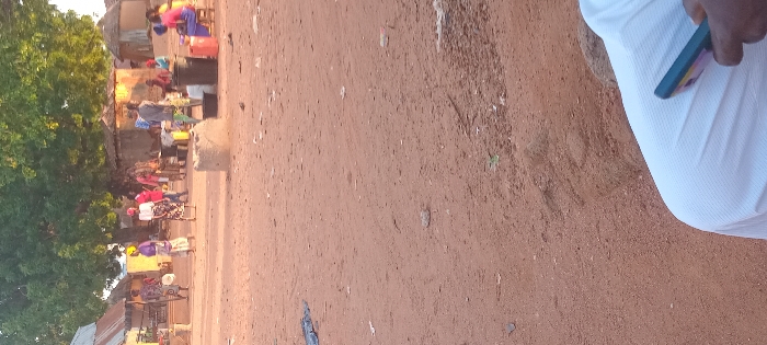 A dirt road scene unfolds with people clustered around buildings in the distance, potentially a market. Trees line the edge of the scene. A person wearing a white shirt is partially visible on the right side. They appear to be holding a mobile phone. The ground is reddish-brown, with small plants and debris scattered. The image is bathed in warm, hazy light.