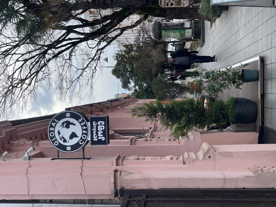 The image displays an urban street scene in Batumi, Georgia, captured on an overcast day. A two-story building, painted a faded light pink with ornate classical architectural detailing, occupies the left side of the frame. Attached to this building is a circular black and white sign featuring "GLOBAL COFFEE" and a stylized globe icon, with a smaller rectangular sign beneath it showing the Georgian script "გლობალ კოფე". Two white security cameras are mounted above the primary sign. Along the sidewalk in front of the pink building, multiple potted plants are arranged, including a tall, conical evergreen in a dark gray planter and smaller green leafy plants in green pots, some positioned on a low wooden platform. The sidewalk is paved with light gray rectangular tiles. On the right side of the sidewalk, a male subject walks towards the viewer. He is dressed in a dark jacket, dark pants, and a dark baseball cap. Additional pedestrian traffic is visible further down the sidewalk. The right side of the street is lined with bare deciduous trees, some adorned with small white string lights, and a prominent palm tree. A green, ornate cylindrical kiosk or display stand is also present on the sidewalk. In the background, other buildings line the street, with parked vehicles partially visible.