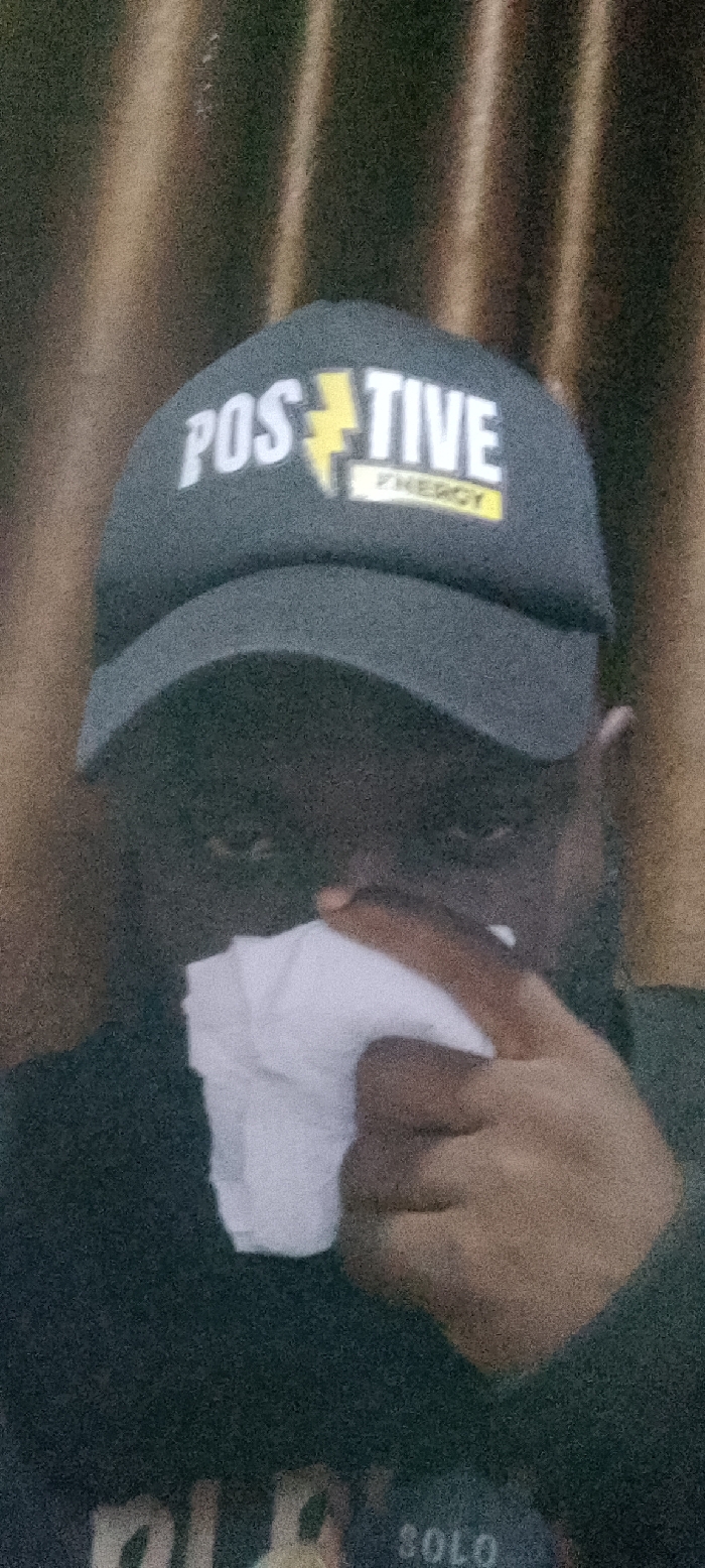 close-up of a person's face. The person is wearing a black cap with the words "POSITIVE ENERGY" in yellow letters. They are wearing a black shirt with the word "SOLO" written on it. The person is partially obscured by a white cloth. They appear to be in an indoor setting. The image is taken from a first-person perspective. The coordinates 7.135, 6.755 correspond to a location in the city of Idah, Nigeria. The image does not provide enough information to determine the exact location within the city. The person is looking down at their hands. The image does not show any other people or objects. The environment is dark and blurry. The image does not reveal any details about the individual's feelings or thoughts. The image is poorly lit and somewhat out of focus.