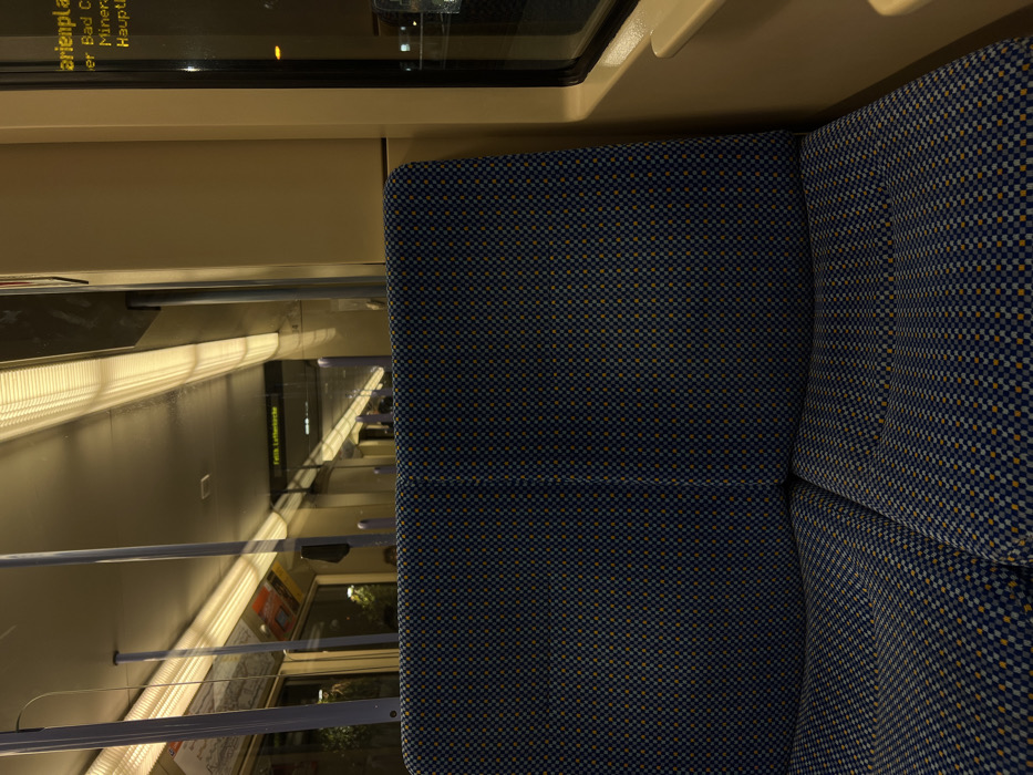 A textured, two-section blue and yellow seat is in the foreground. Beyond it, a window reveals a train platform at Felix-Littenkruke station. The interior of the train includes beige paneling, overhead lighting, and handrails. Window text displays destinations. The view outside showcases the station's architecture and signage.