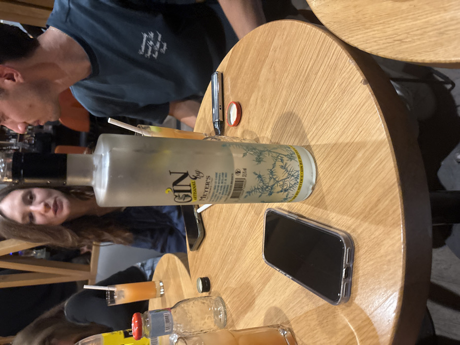 The image depicts an indoor scene at a bar or restaurant in Sélestat, France, with multiple individuals seated around light-toned wooden tables. In the foreground, a prominent frosted glass bottle of "Meyer's Artisanal Gin" stands upright on a round wooden table. The bottle features a black cap, a label displaying blue botanical illustrations (juniper branches), a barcode, and the text "23.5% vol.". To the immediate left of the gin bottle, a black smartphone in a clear protective case rests with its screen facing down. Slightly behind and to the left of this phone, a second dark-colored smartphone is partially visible. Further to the left, an empty or nearly empty clear glass bottle with a red and white cap, identical to a loose cap resting on the table to the right of the gin bottle, is visible alongside a glass containing an orange-hued beverage with a white straw. To the right of the gin bottle, a silver cylindrical vape device with a black mouthpiece lies on the table next to the aforementioned red and white bottle cap. Behind the gin bottle, another glass containing an orange-hued beverage with a white straw is visible. Two individuals are partially visible in the mid-ground. On the left, a female with long, wavy brown hair, wearing a dark blue top, is looking towards the right with her mouth slightly open, suggesting she is speaking or reacting. On the right, a male with short dark hair, wearing a dark teal t-shirt with white text on the left chest, is positioned in profile, looking towards the left. His right arm rests on the table. The background is softly blurred, revealing dark furnishings, possibly other tables and chairs, and some structural elements, indicating a casual dining or drinking establishment with artificial lighting. The overall impression is one of social interaction in a relaxed setting.