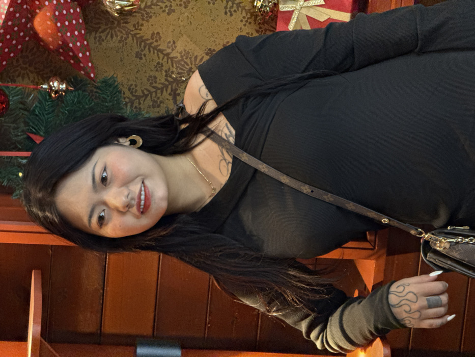 An indoor portrait displays a female subject positioned slightly off-center. She has long, dark hair, dark eyes, and a slight smile while looking towards the viewer's right. She wears gold-colored hoop earrings and a thin gold-colored necklace. Her attire consists of a black, ribbed, long-sleeved, off-the-shoulder top or dress. A dark brown cross-body bag with a repeating patterned strap is visible, extending diagonally across her torso. Tattoos include a light-toned design on her upper left chest/shoulder, and flame motifs on the back of her right hand near the knuckles. A dark band-like tattoo is on her right ring finger. Her right hand displays manicured nails with white polish and rests on a dark reddish-brown wooden surface. This surface forms part of a paneled wall on the left side of the background. The right side of the background features a lighter-colored wall with a subtle patterned wallpaper, decorated with Christmas-themed items including green garlands, red baubles, a red fabric element with white polka dots, and a red gift box with a gold ribbon. The specific location within the city of Liangjiang, China, cannot be determined from the provided image.