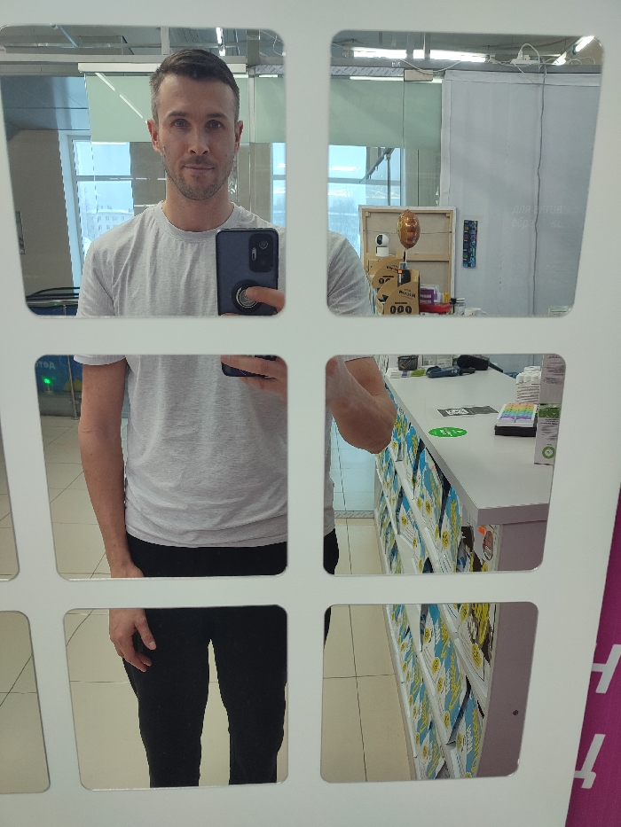 - "A male individual, estimated to be in his 30s-40s with short dark hair and light stubble, is depicted taking a mirror selfie inside a pharmacy located in Chaikovsky, Russia" by FM-sBAuS2, licensed under CC BY 4.0