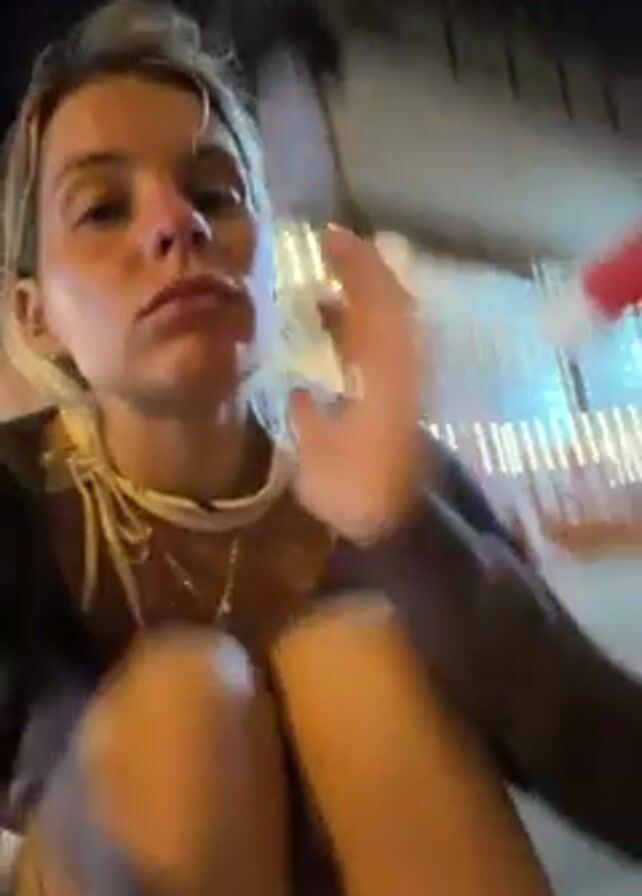 A woman with blonde hair pulled back is sitting outside in a brightly lit market area at night. She has her arms resting on her knees and her face tilted towards the camera. She then puts her hand to her chin, looking thoughtful. The camera quickly pans away to show a street scene with blurred moving lights.