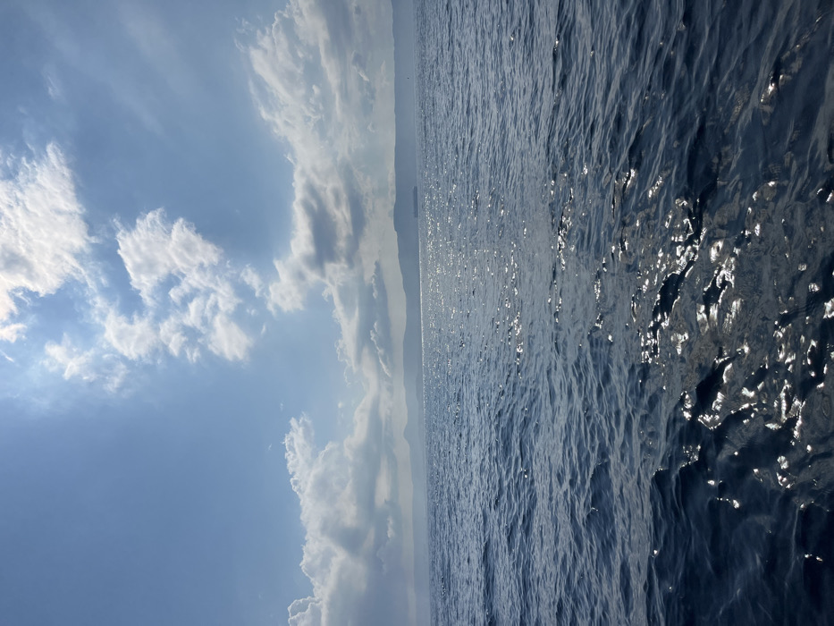 An image shows a seascape with a light blue sky filled with fluffy white clouds on the left side. The right side of the image features a deep blue sea with sunlight shimmering on the surface, creating bright highlights. In the center of the image, a faint landmass is visible on the horizon, separating the sky and sea. The photograph is taken from a low angle, emphasizing the vastness of the ocean.