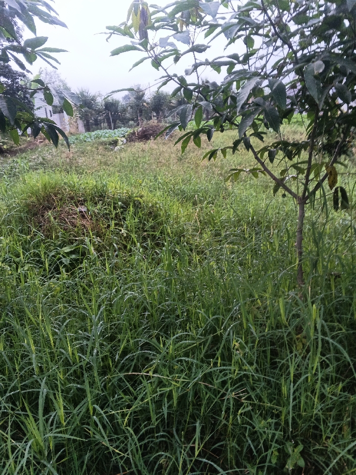 An overgrown grassy field dominates the scene, with tall, wet blades of grass covering the foreground. A small tree with green leaves stands on the right. In the background, a glimpse of a house and garden is visible through branches. A patch of overgrown grass stands out in the middle of the field. The overall tone is natural and slightly misty.