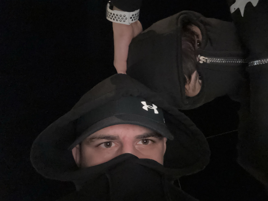 The image depicts two individuals in a close-up, diagonally oriented shot against a uniformly dark, black background. While the visual content of the image offers no discernible location details, the scene is specified as being in Strasbourg, France. The individual in the upper-left portion of the frame wears a black hooded sweatshirt with the hood up, and a dark baseball cap featuring a white Under Armour logo on the front. Their brown eyes are clearly visible and directed towards the camera. The individual in the lower-right portion of the frame wears a black hooded garment, resembling a balaclava or a tightly zipped hoodie, which obscures most of their face except for their brown eyes and visible brown hair on the forehead. A silver zipper is prominent down the center of this garment. This individual also looks directly at the camera. A hand, presumably belonging to the upper-left individual, is placed on the head of the lower-right individual. This hand wears a white smartwatch with a perforated white band, consistent with a Nike Sport Band for an Apple Watch.