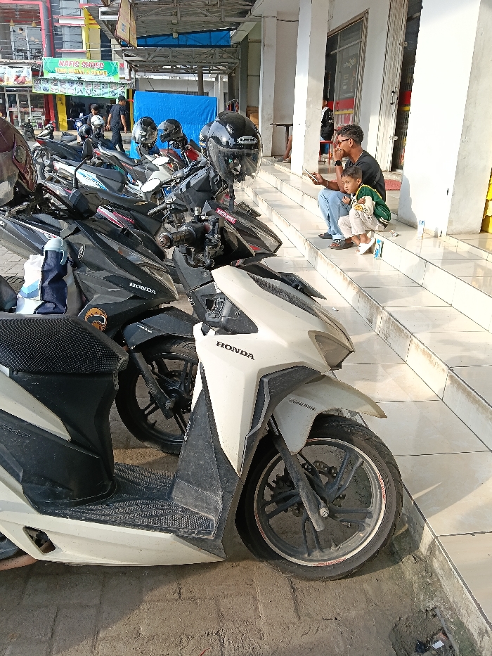 This image captures a street scene in Sumberejo, Indonesia, under bright daylight. In the foreground and mid-ground, a dense row of numerous scooters, predominantly black and white Honda models, are parked on a paved surface. Multiple motorcycle helmets, including a prominent black full-face helmet with a clear visor, are visible on or near the parked vehicles. On the immediate left, a white Honda scooter is partially visible. To the right, two individuals are seated on the lower concrete steps of a building. An adult male with short, dark, curly hair and a beard, wearing a black t-shirt and blue jeans, sits holding a mobile phone in his left hand. Next to him, on a lower step, is a young child wearing a green and white jacket and light-colored pants, looking towards the left foreground. Scattered refuse, possibly plastic packaging, is visible on the steps near the child. In the background, behind the parked motorcycles, commercial buildings are visible, including one with a green sign reading "NAFIS SHOES." A blue tarp or fabric structure is also visible further back. Several indistinct figures can be observed near the buildings and other motorcycles in the background. Shadows cast by the vehicles and buildings indicate strong sunlight.